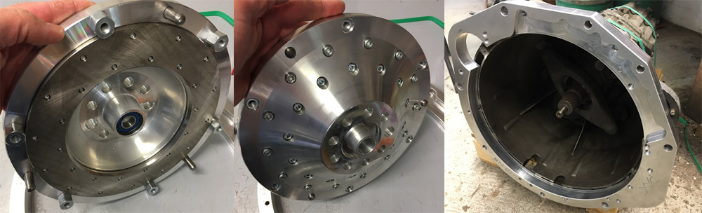 My flywheel weighs in at about 11lbs, is made from aluminum, with a bolt in cast plate for the clutch plate and a center bearing.