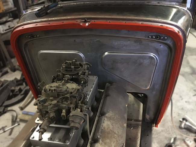 After grinding the spotwelds the new spacer and the front edge of the cowl got a coat of red primer.