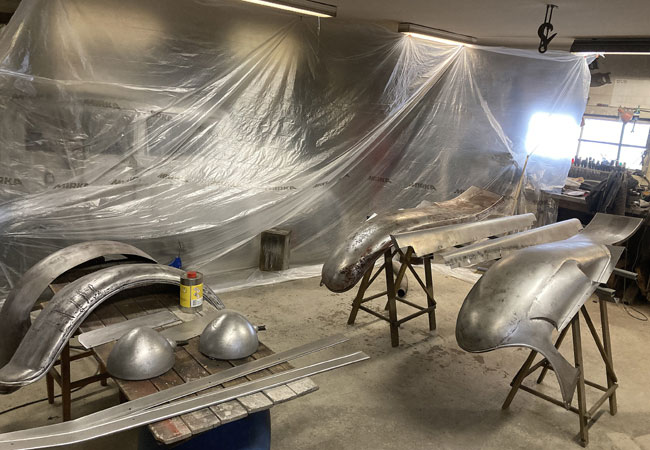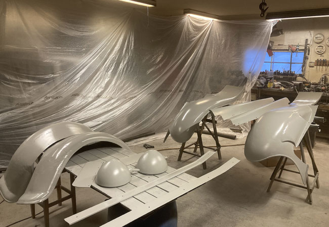 coats of epoxy on the fenders, aprons, running board moldings and head light buckets.